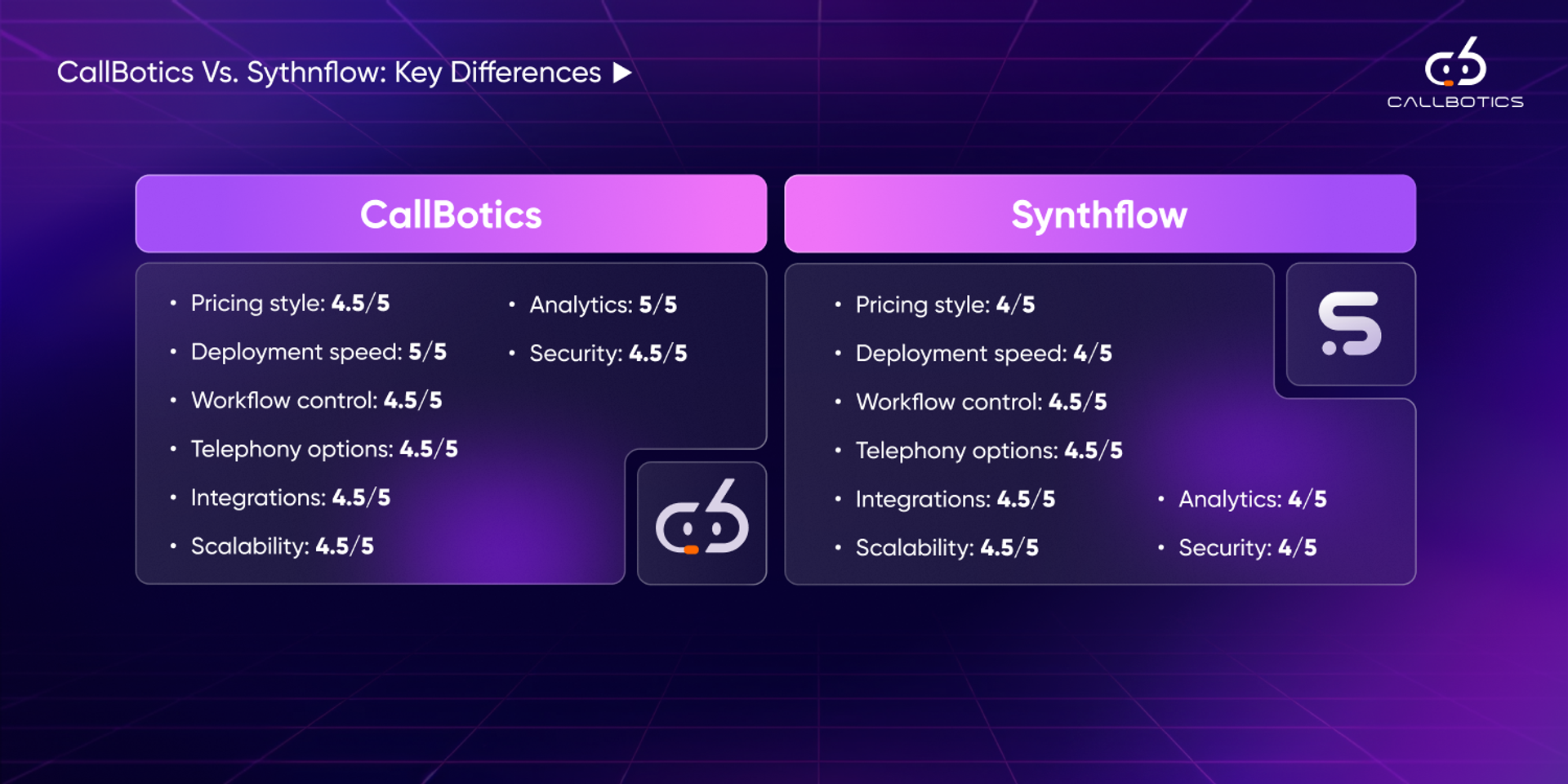 The biggest differences between CallBotics and Synthflow show up in the areas that most affect deployment success and long-term value. Both platforms support AI voice automation, but they are positioned somewhat differently in how they approach pricing, rollout, workflow control, integrations, scale, and operational visibility. For most buyers, the right choice comes down to which platform fits their deployment model more naturally.