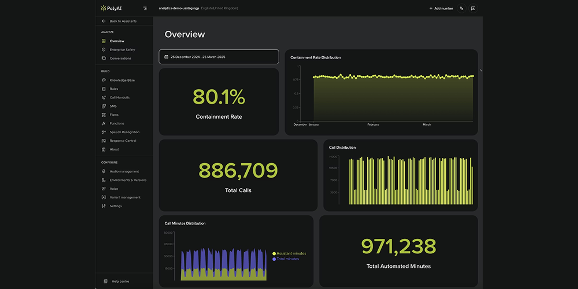 Caption: PolyAI analytics dashboard showing conversation metrics and containment performance.