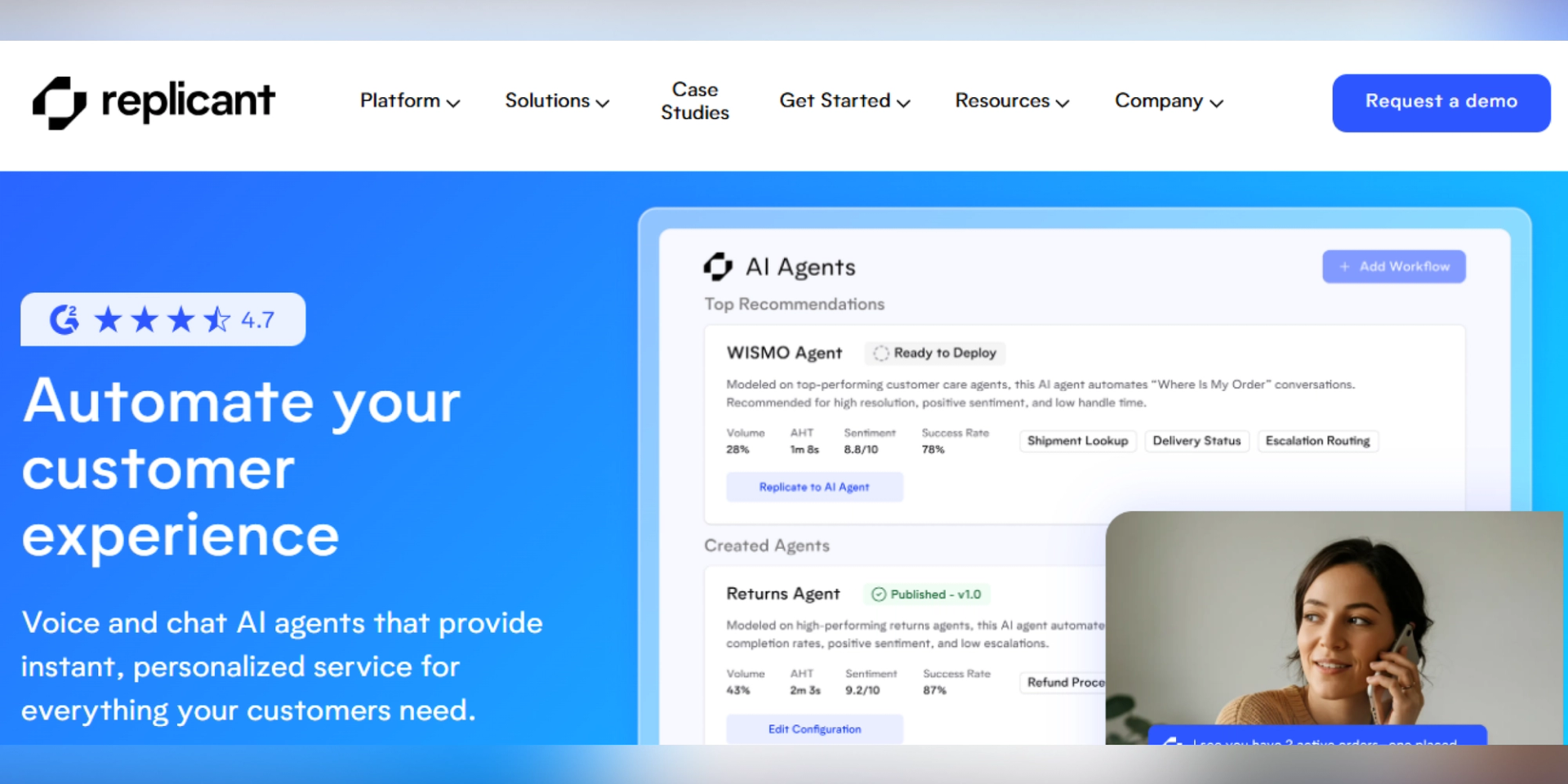 Replicant is an agentic AI-based customer service platform that automates complex conversations by replicating the top-performing human agents within the organization. The platform offers end-to-end customer issue resolution with complete visibility over how the interactions were handled.