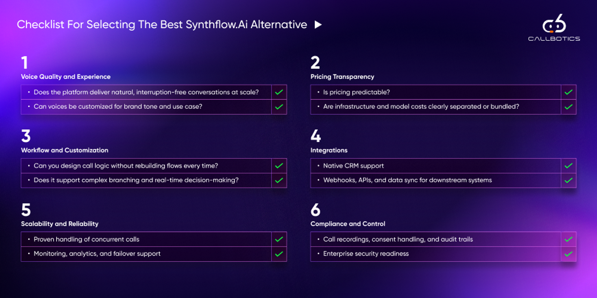 Most enterprises using Synthflow.ai face cost inefficiency and operational challenges, especially if they are a rapidly growing team trying to scale. Below is a list of 9 Synthflow.ai alternatives, with CallBotics as the number one choice, meeting the maximum criteria, for you to choose from: